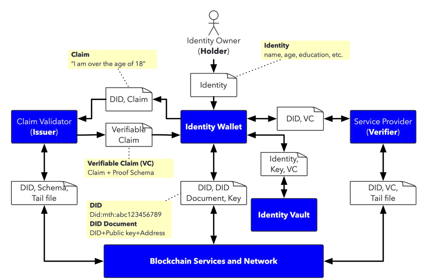 ในการระบุตัวตน (User Authentication) ใน SSI System จะใช้ข้อมูลอ้างอิงที่นิยมเรียกว่า Claim หรือข้อกล่าวอ้าง ยกตัวอย่างเช่น “ฉันชื่อสมชาย” หรือ “ฉันอายุมากกว่า 18 ปี”
